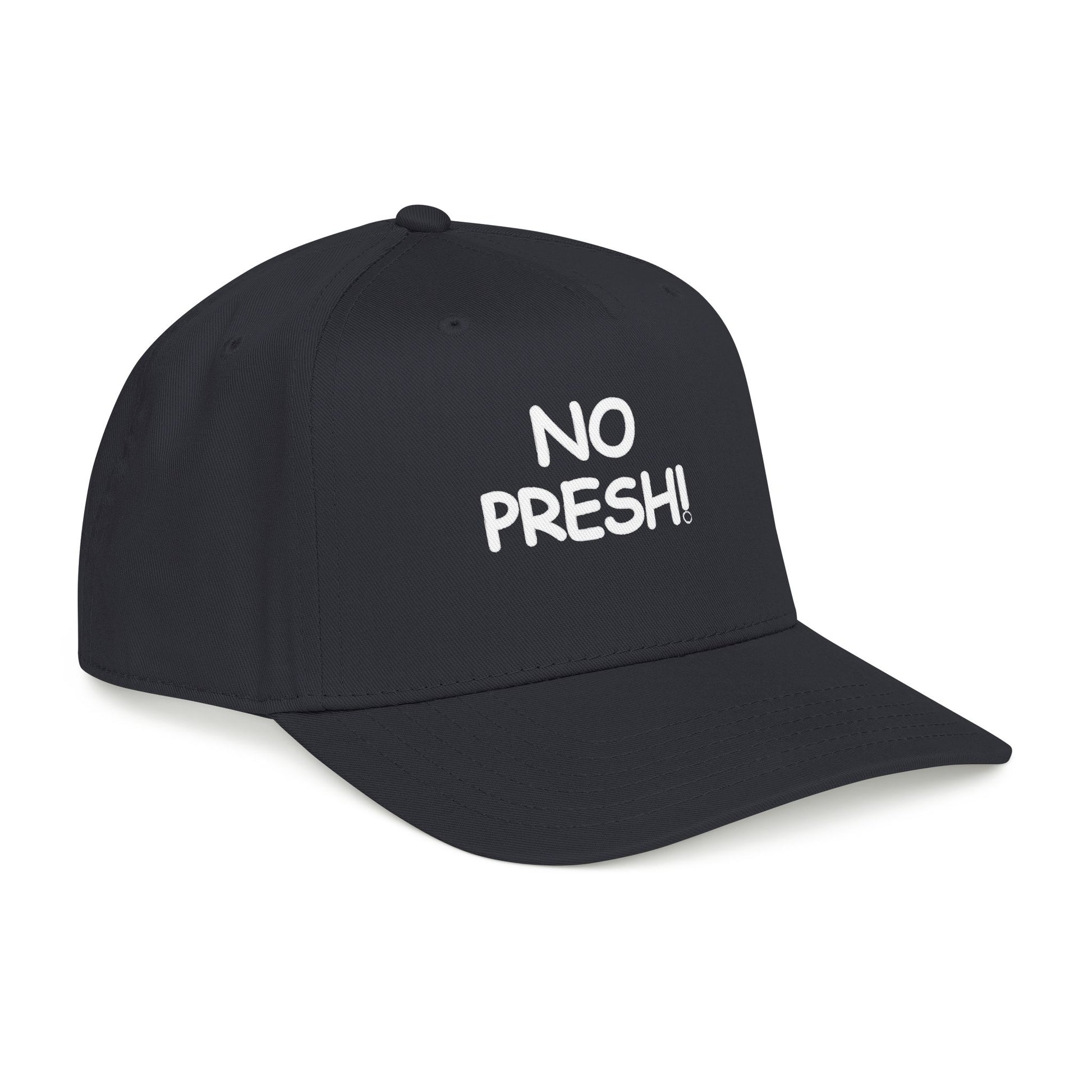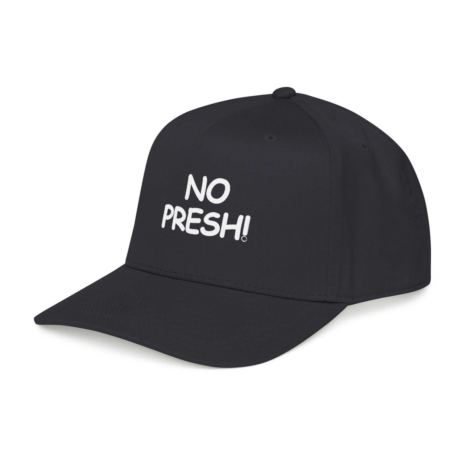 This mid-profile baseball cap brings effortless, everyday attitude to your wardrobe. The two-tone design — a soft sand crown with a navy undervisor and brim — pairs cleanly with casual denim or a laid-back hoodie. Bold, hand-lettered embroidery across the seamless front panel reads NO PRESH!, giving the hat a cheeky, confident voice without shouting. Structured five-panel construction keeps the shape crisp while the matching fabric sweatband and undervisor add comfort and a finished look. A durable snapback lets you adjust the fit in seconds, so it slips on for quick errands, outdoor hangs, or road trips where you want to stay low-key but not invisible.