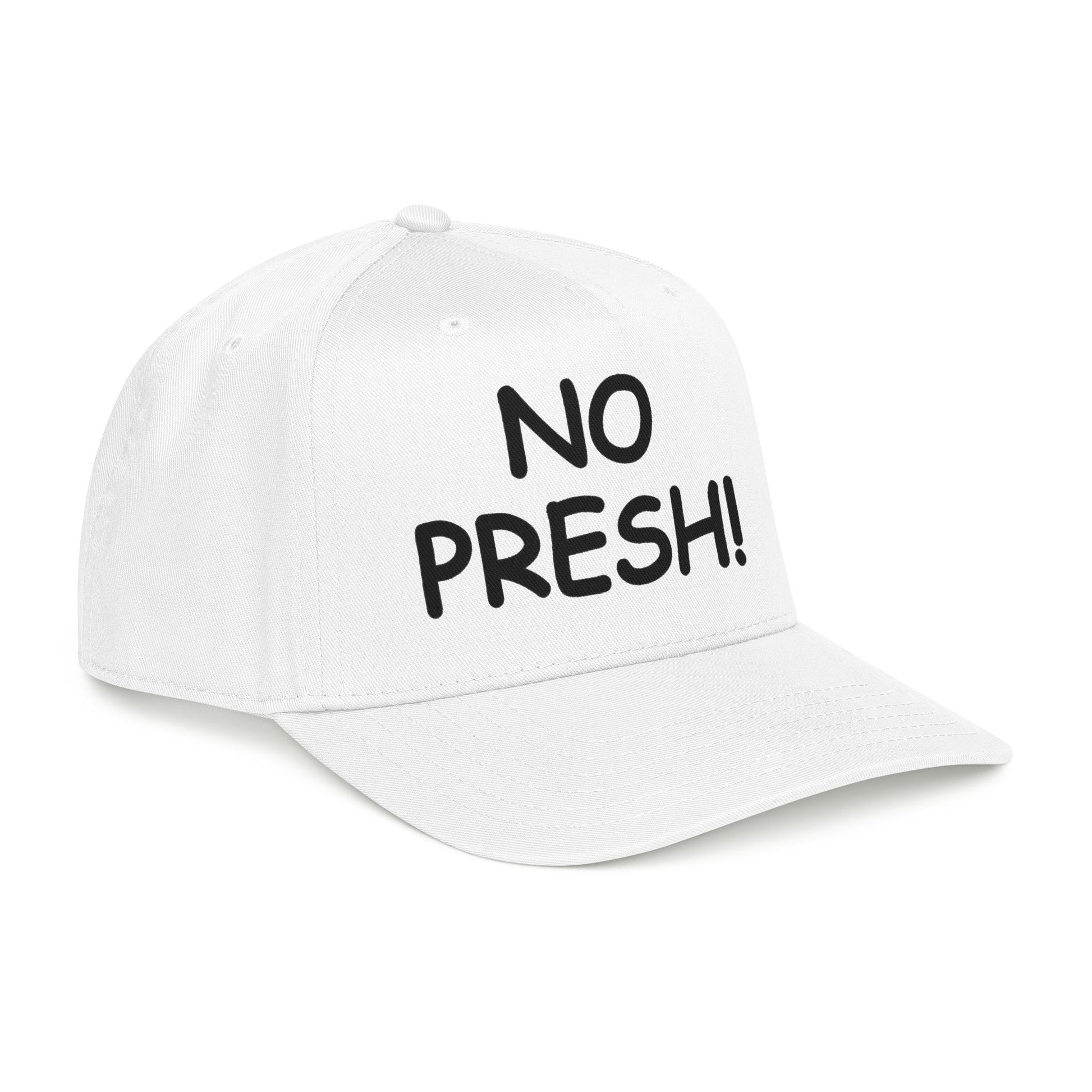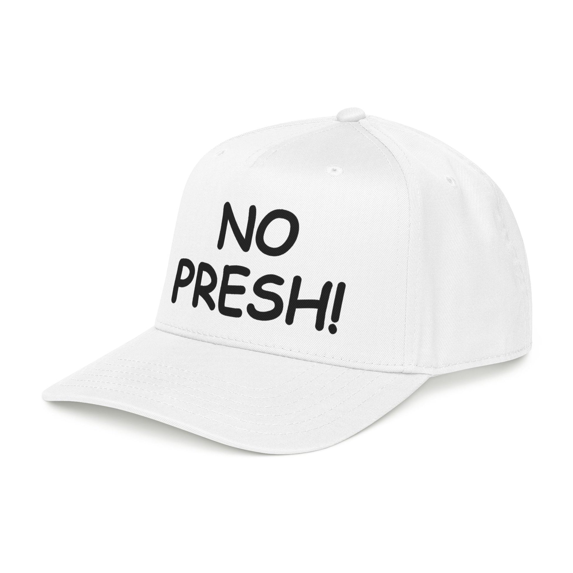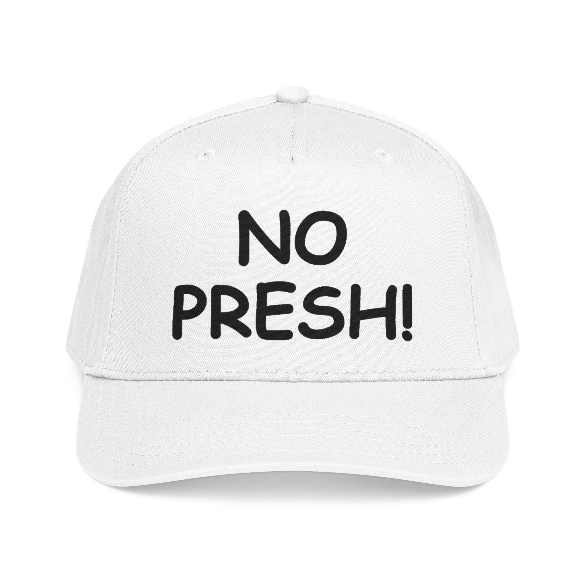 This mid-profile baseball cap brings effortless, everyday attitude to your wardrobe. The two-tone design — a soft sand crown with a navy undervisor and brim — pairs cleanly with casual denim or a laid-back hoodie. Bold, hand-lettered embroidery across the seamless front panel reads NO PRESH!, giving the hat a cheeky, confident voice without shouting. Structured five-panel construction keeps the shape crisp while the matching fabric sweatband and undervisor add comfort and a finished look. A durable snapback lets you adjust the fit in seconds, so it slips on for quick errands, outdoor hangs, or road trips where you want to stay low-key but not invisible.